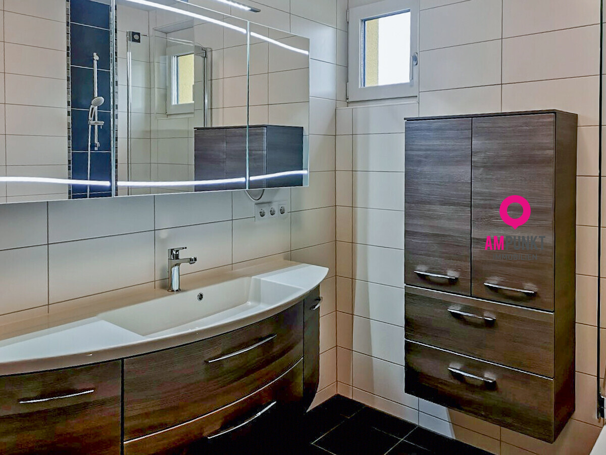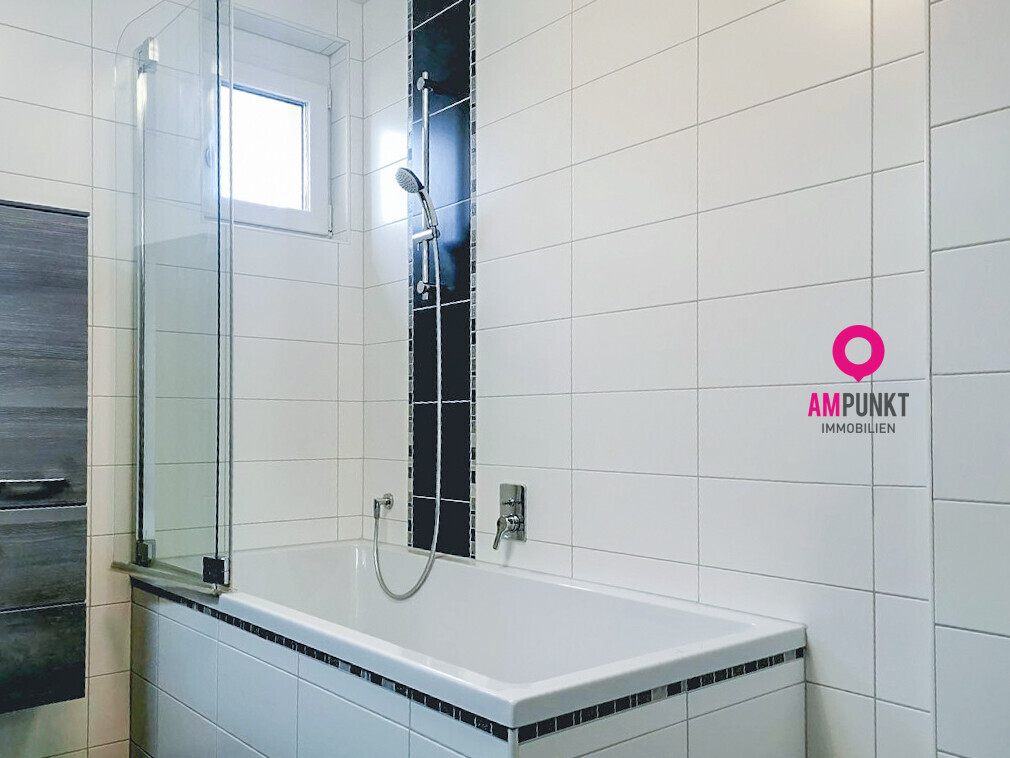 Im Bad treffen dunkle Fliesen auf weiße Flächen. Reduziert, stimmig, mit Badewanne und integrierter Dusche. Dazu ein separates WC – praktisch, unaufgeregt, wie es sein soll.