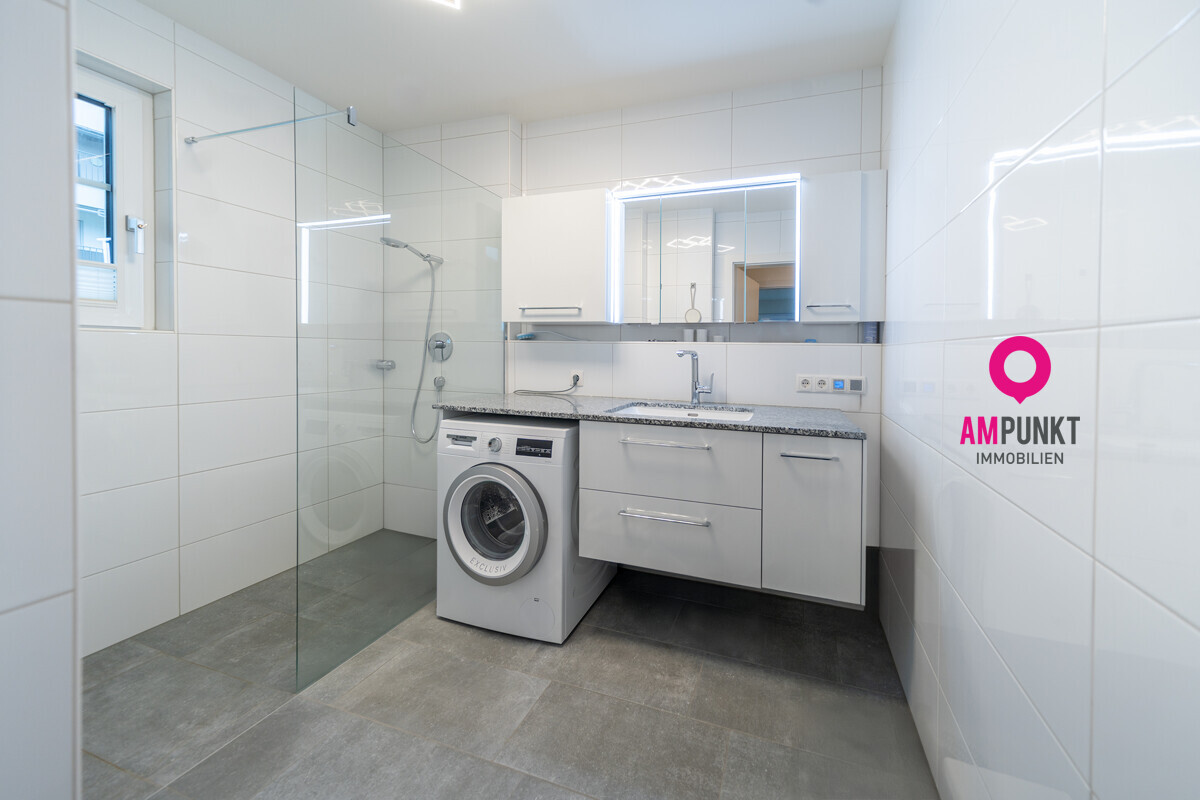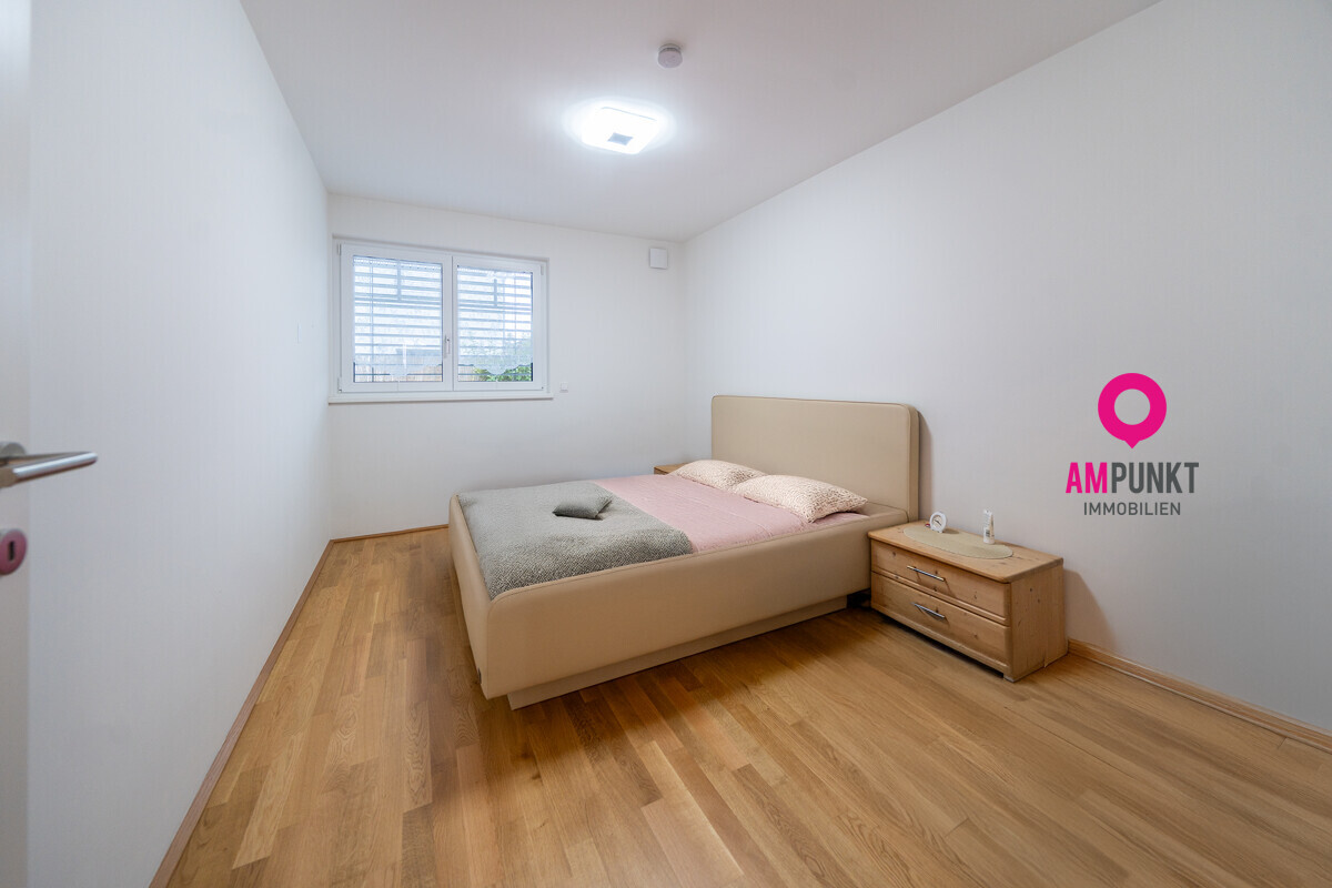 Das Setup passt: ein ruhiges Schlafzimmer und ein zweites Zimmer für Kind, Gäste oder Home-Office. Im Bad gibt’s Tageslicht, eine bodenebene Dusche und einen Waschtisch mit Granitplatte; die Waschmaschine ist darunter clever verstaut. Das WC liegt separat – mit Fenster und Handwaschbecken. Fußbodenheizung sorgt für angenehme Wärme, die Wohnraumlüftung für frische Luft, ohne ständig kippen zu müssen. Baujahr 2021 – zeitgemäß, effizient.