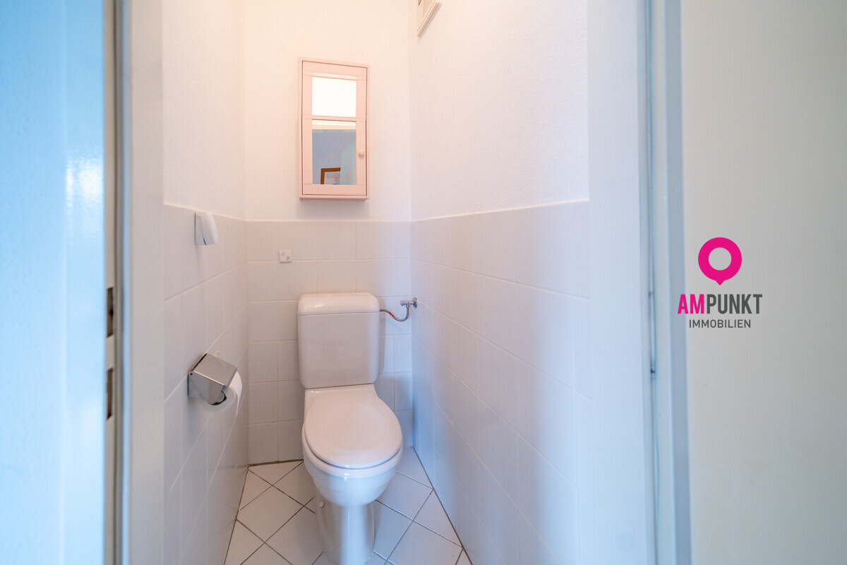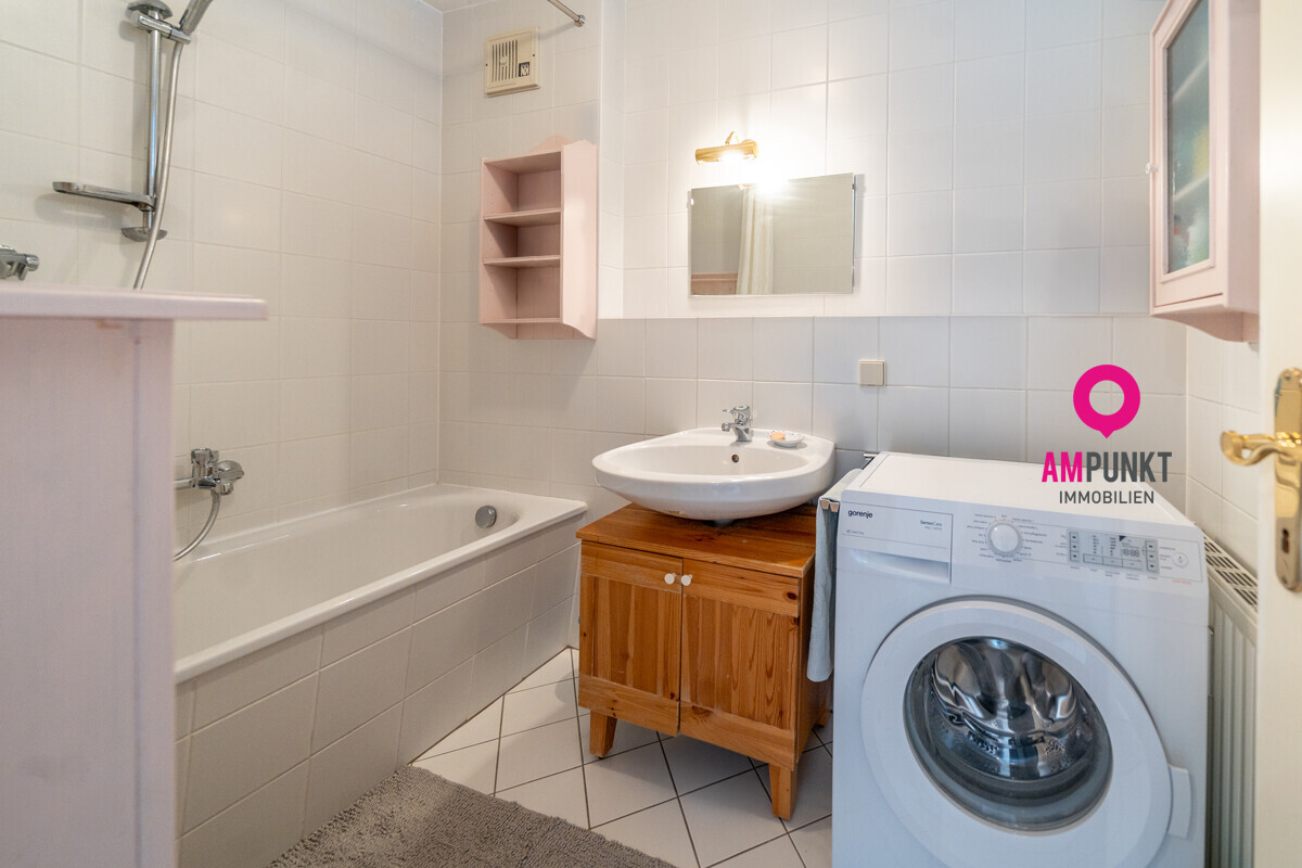 Das Bad ist gepflegt, mit Wanne und Waschmaschinenanschluss, und auch sonst ist die Wohnung in einem sehr ordentlichen Zustand. Stauraum gibt es im eigenen Kellerabteil, zusätzlich stehen ein Fahrradkeller und ein Gemeinschaftsgarten zur Verfügung