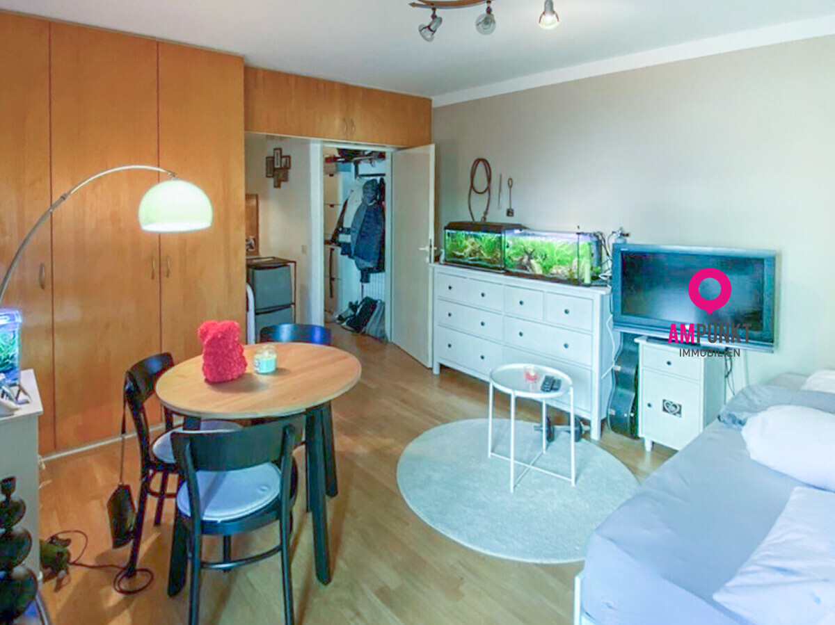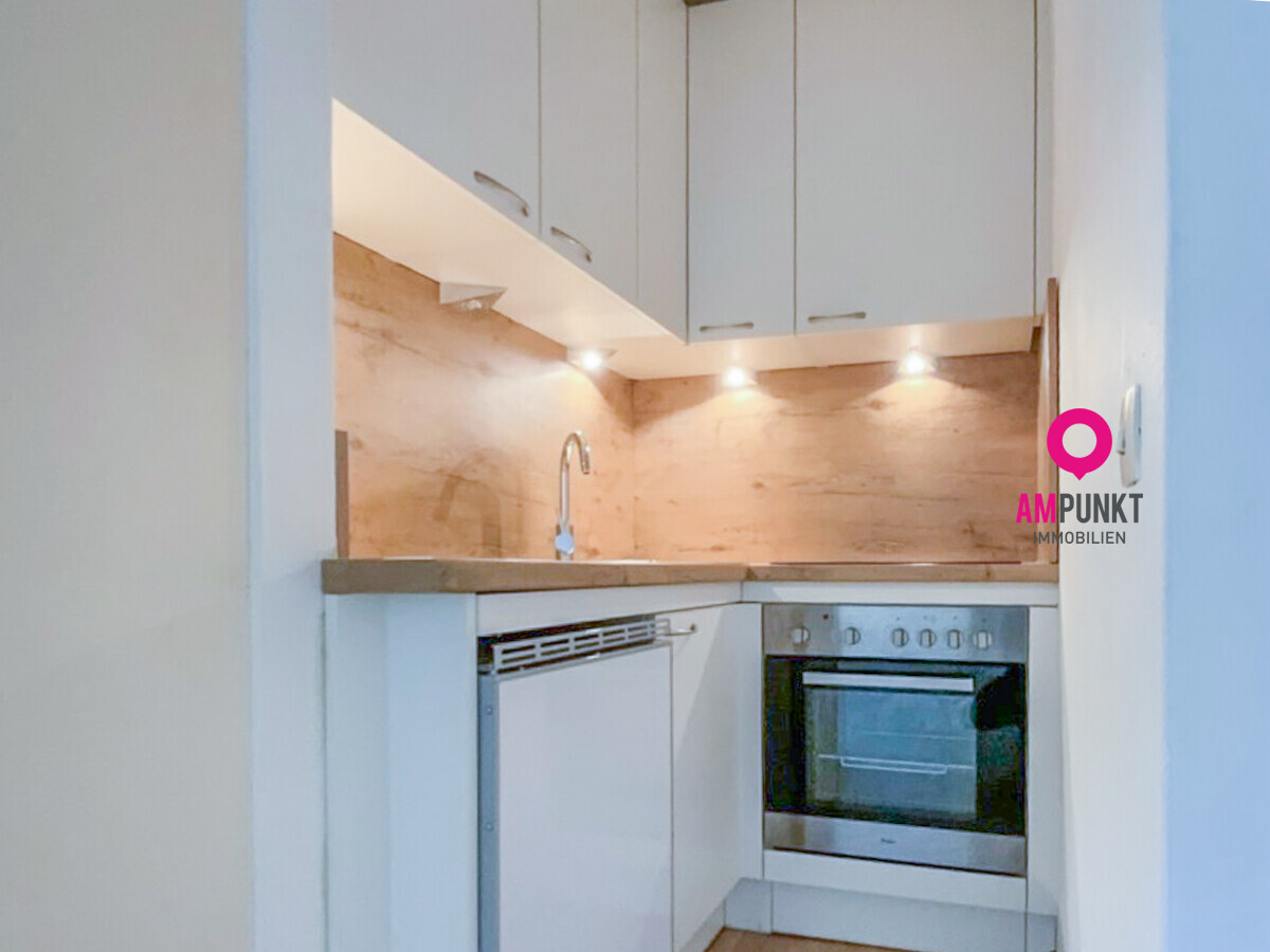 Die perfekt geschnittene 27m² große Wohnung liegt im ersten Stock. Die Küche hat alles, was man so braucht: Herd mit Ceran-Kochfeld, Kühlschrank und ausreichend Stauraum. Das Badezimmer ist schlicht und praktisch: mit Dusche, Waschbecken samt Unterschrank und Toilette. Das Highlight: Der kleine sonnige Balkon!