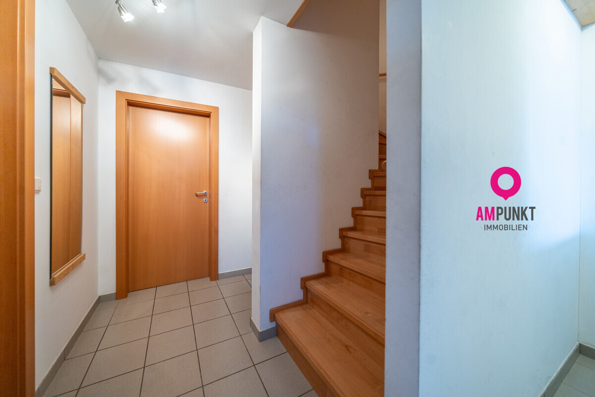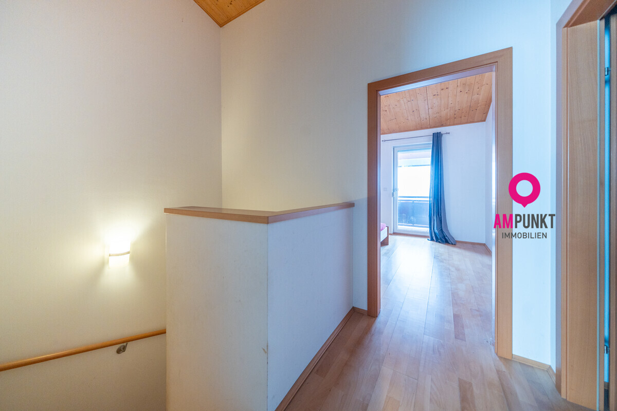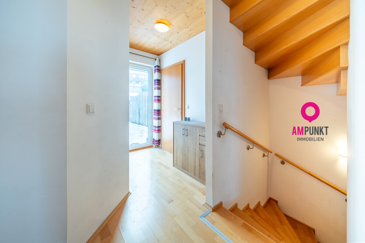 Diese Doppelhaushälfte liegt in erhöhter, ruhiger Wohnlage in Neumarkt am Wallersee. Die Hanglage ist hier kein Nachteil, sondern Teil des Konzepts: Der Zugang erfolgt ebenerdig über das Carport – praktisch und geschützt vom Wetter!