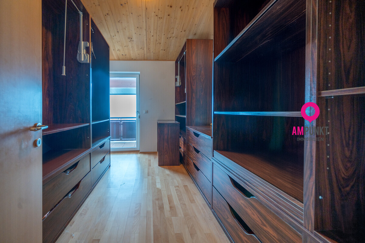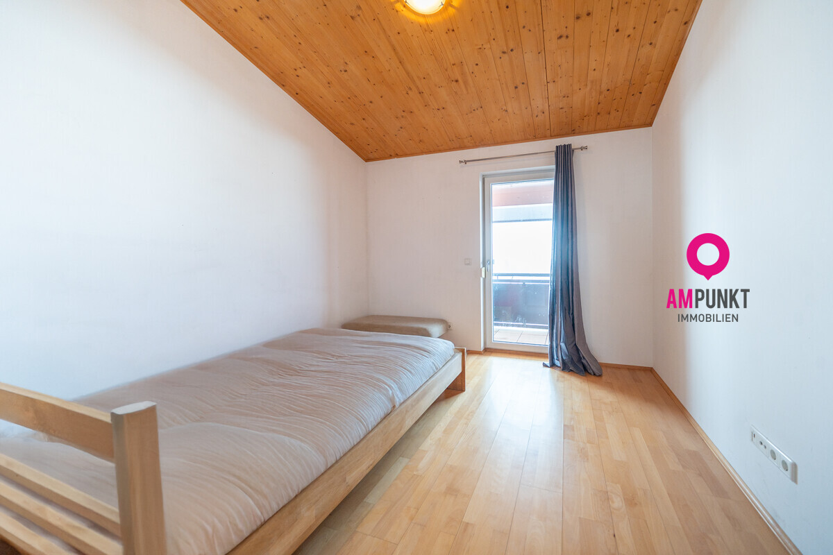 Das Obergeschoss bietet zwei Schlafzimmer sowie einen Schrankraum, der ohne großen Aufwand als weiteres Schlafzimmer genutzt werden kann. Das Badezimmer ist mit Tageslicht, Dusche und Badewanne ausgestattet. Der westseitige Balkon ist sowohl vom Kinderzimmer als auch vom Schrankraum aus begehbar.