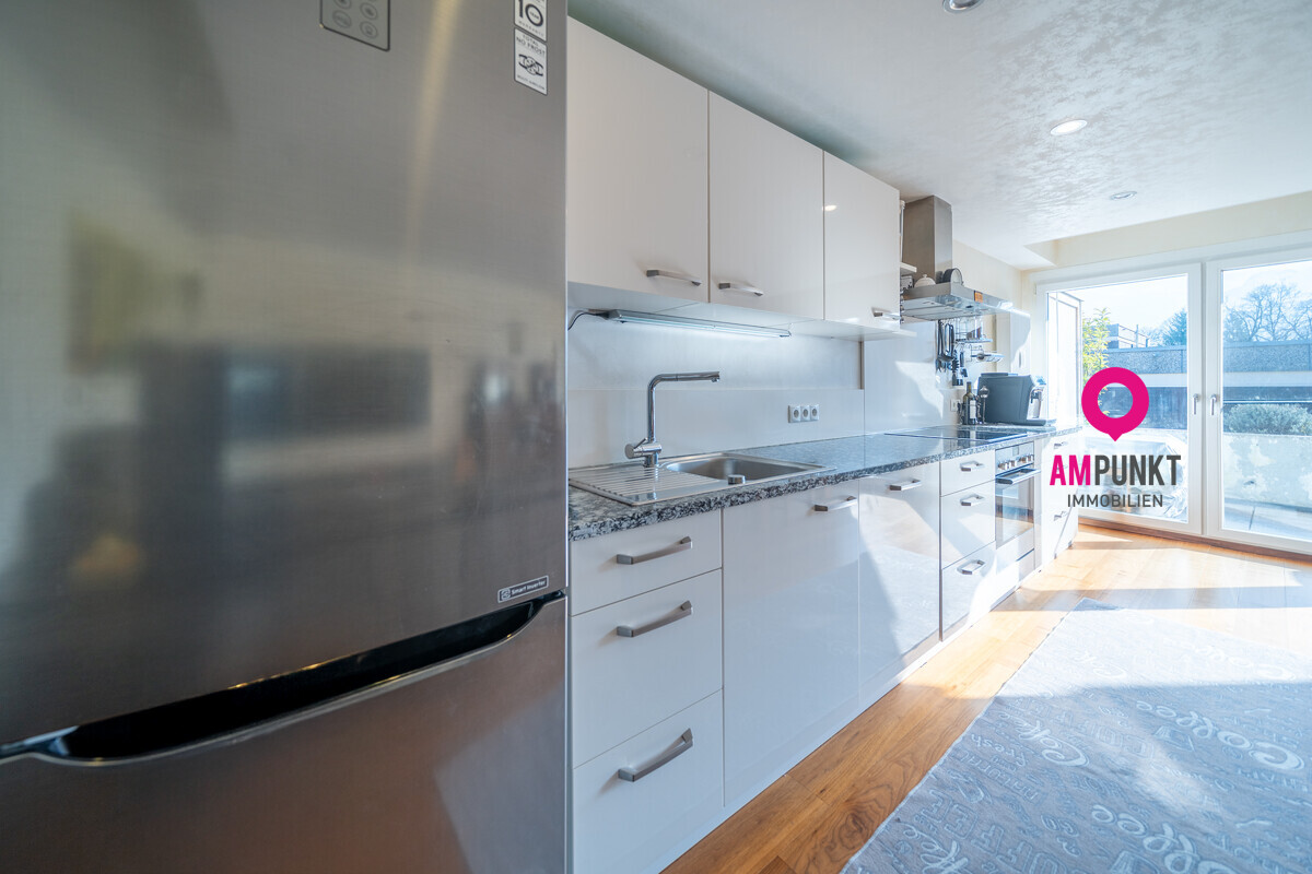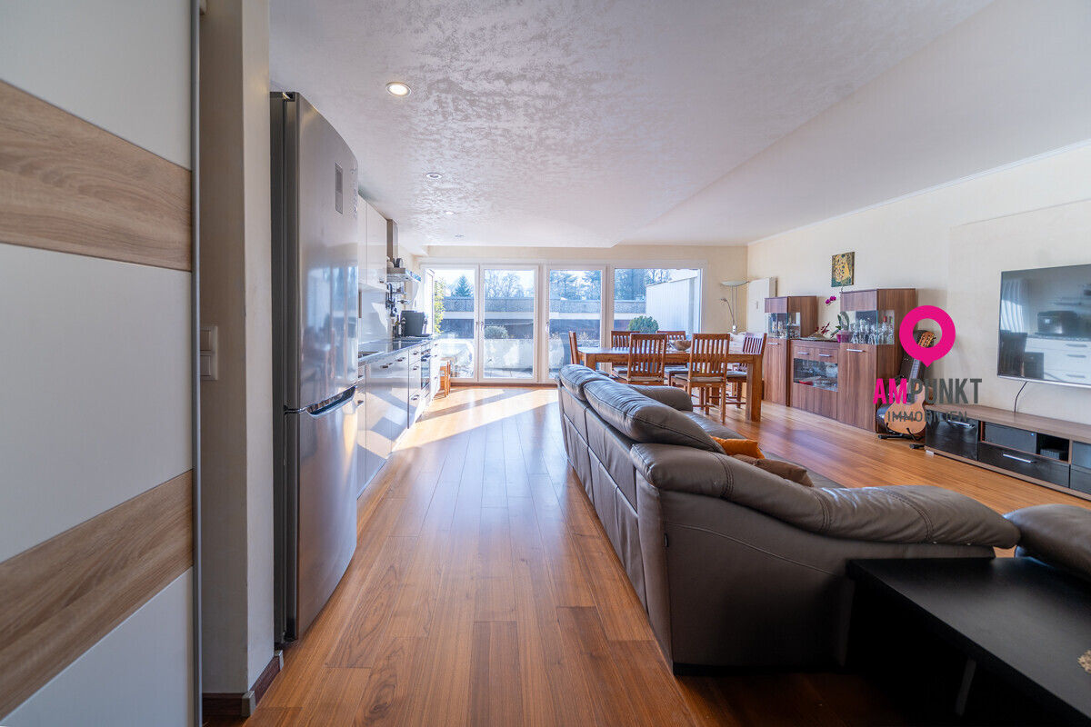 Beim Eintreten steht man direkt im großzügigen Wohn-/Essbereich mit moderner, offener Küche. Helle Flächen, klare Linien, ein Raum, der Begegnung zulässt. Von hier geht es hinaus auf die südseitige Terrasse: Sonne im Gesicht, frische Luft, ein Frühstück im Freien oder ein Glas Wein am Abend, während der Tag langsam ausklingt.