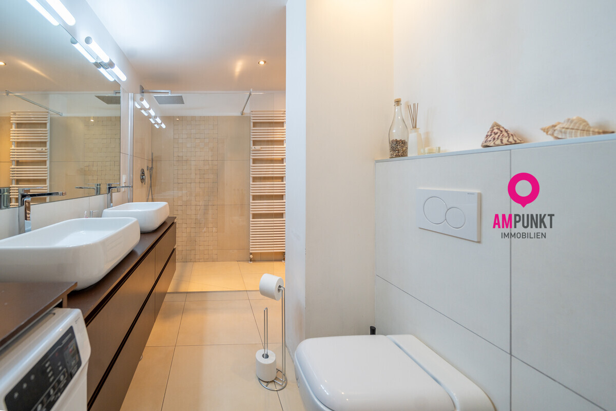 Zwei Schlafzimmer bieten Rückzug und Flexibilität – Schlafen, Arbeiten, Gäste empfangen. Das Badezimmer kombiniert Funktion mit Komfort: Dusche für den schnellen Start in den Tag, Badewanne zum Abschalten, Doppelwaschtisch, Toilette, Bidet und ein Handtuchheizkörper, der wohlige Wärme spendet.