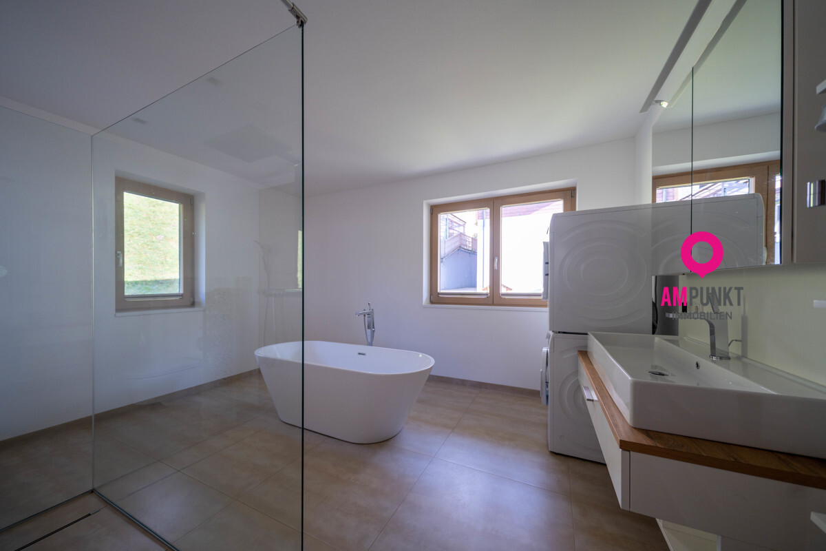 BAD mit Wellnesscharakter. Die Badewanne ist freistehend, mit edlen Armaturen. Wer das Wasser lieber von oben möchte, steigt in die Walkin-Dusche mit Regenbrause. Wie Sie auf den Fotos erkennen können, gibt es hier Tageslicht und Platz für Waschmaschine und Trockner.