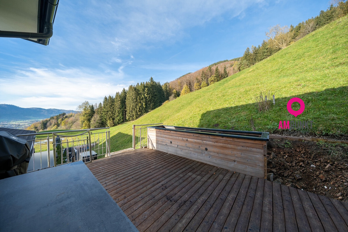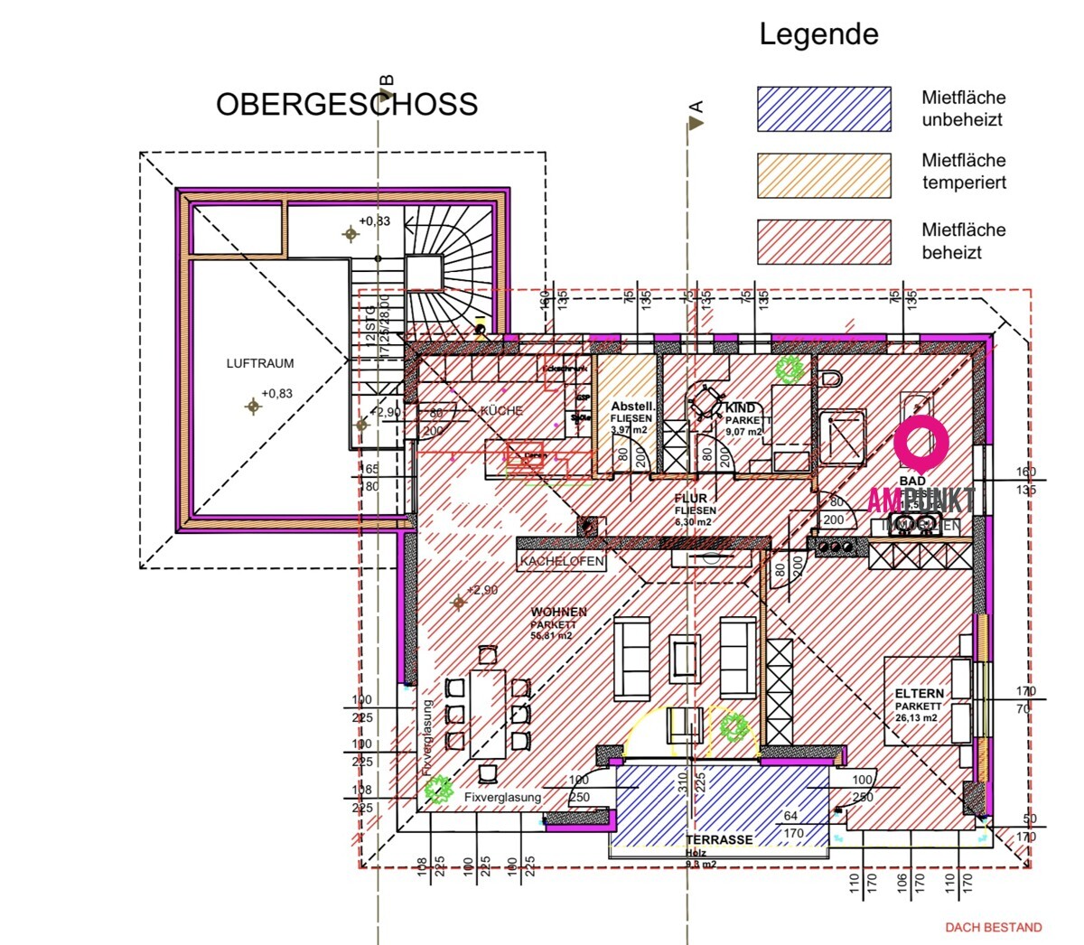 Ein Stockwerk höher haben Sie das Wohn-/Essbereich, eine offene Küche, sowie zwei weitere Räume: 26 und 9 m². Diese bieten sich als Schlafzimmer für Sie und das Kind an, eines davon und das Wohnzimmer haben einen Balkon mit Grünblick. Im Wohnzimmer hätten Sie auch die Möglichkeit, einen Kamin anzuschließen.